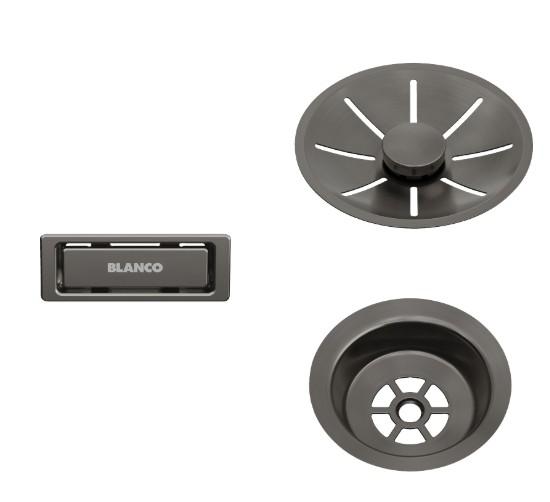 Opgrader din Blanco vask med flot strainer og overløbsskilt i satin dark steel.