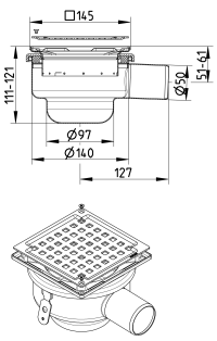 Blücher Square type 114. Til installation mod i beton- og klinkegulve, med vandret Ø50mm udløb, uden membranflange til vådrumssikring.