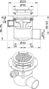 BLÜCHER Domestic-150 justerbar afløb for vinylgulve, med sideindløb og vandret Ø75mm udløb.