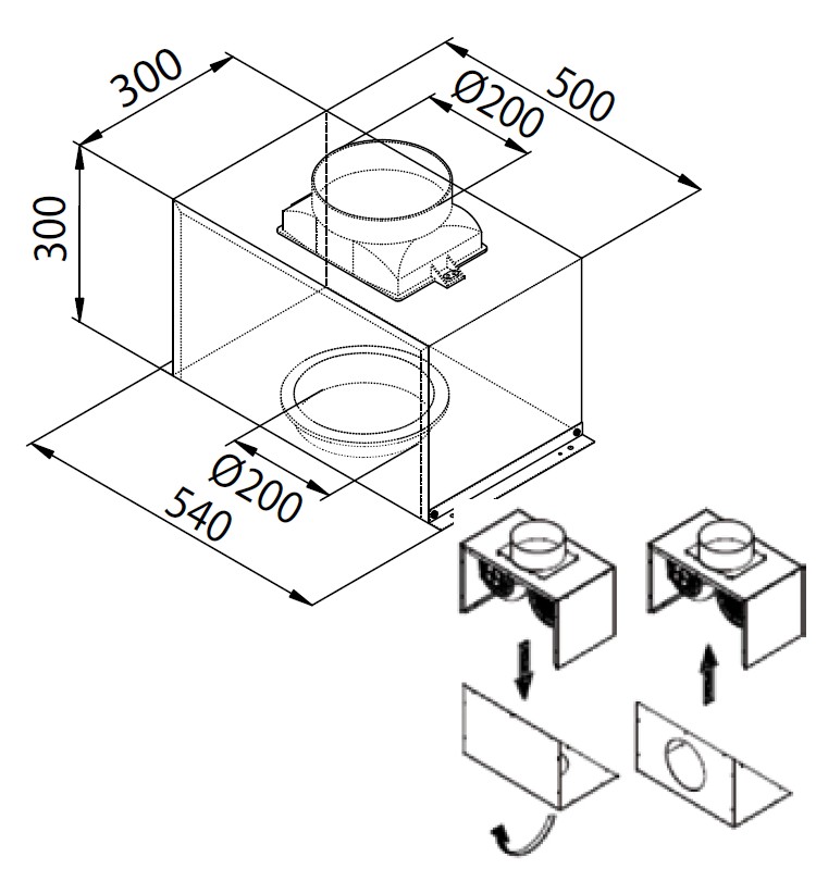Beregnet for indvendig montering på loft. Fleksibel afgang - kan vendes.