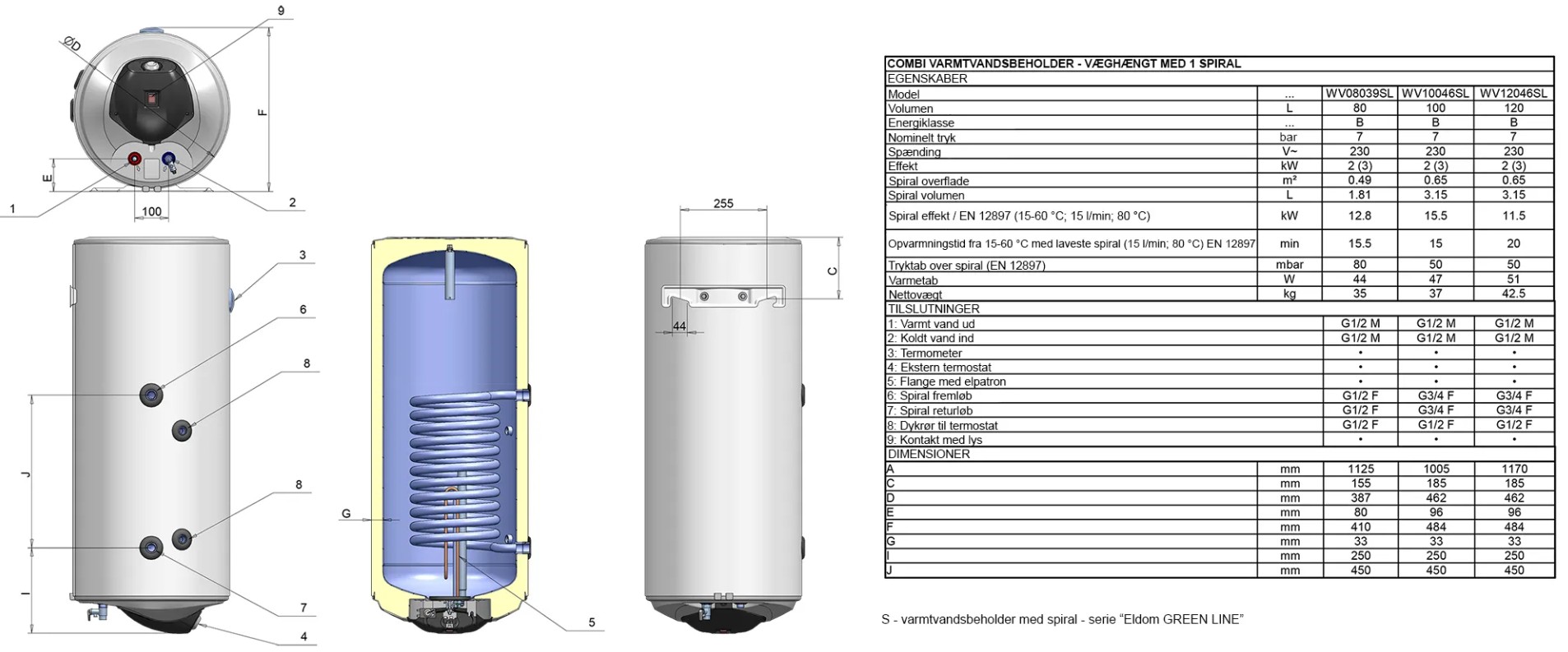 Eldom Combi varmtvandsbeholder 80 L - Væghængt med 1 spiral Effektiv væghængt varmtvandsbeholder / vandvarmer fra ELDOMINVEST Hurtig og nem installation. En ideel varmtvandsbeholder til rum uden indlagt varmt vand eller til yderligere opvarmning af forvarmet vand, f.eks. fra 30 °C vand fra buffertank, til 65 °C vand til opvasken. Beholderen har 1 spiral. Der kan tilsluttes pillefyr, varmepumpe, solvarme, fjernvarme eller en helt anden varmekilde til spiralen i bunden. Vandvarmeren er isoleret med miljøvenligt (CPC fri) polyurethanskum. Det sikrer minimalt varmetab og derved energibesparelser. Beholderen er emaljeret og rustbeskyttet for at sikre lang holdbarhed. Vi anbefaler tilkøb af sikkerhedsamatur - 8 bar til alle varmtvandsbeholdere.