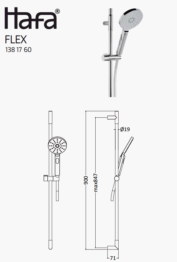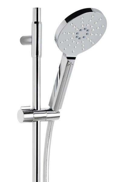 Funktionel brusesæt i krom med brusestang i metal og bruserslange med AntiTwist. Ø 120 mm. Brusestang med justerbare vægbeslag 350-847 mm. Brusesætet indeholder sæbeskål.