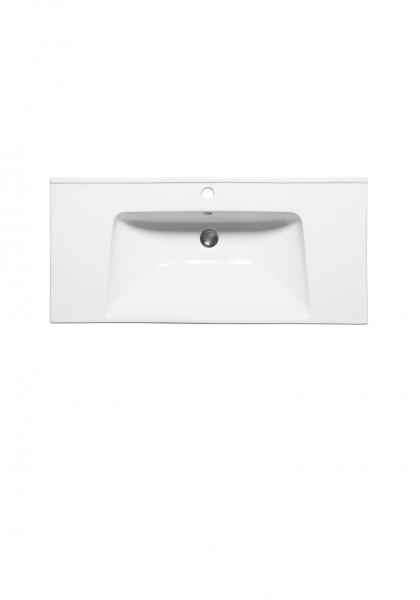 Moderne håndvask i porcelæn med en spændstig form, der strækker sig frem til kanten. Den unikke form harmonerer flot med det tilhørende skabs stramme linjer, og der er afsætningsplads på begge sider.
