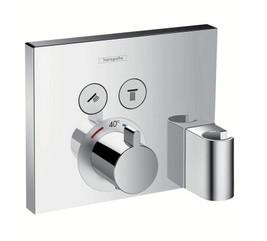 Der åbner og lukker for vandet i henholdsvis hoved og håndbruser. Termostatarmaturet har integreret bruseholder og slangeudtag, der samler funktionerne i en smart løsning.