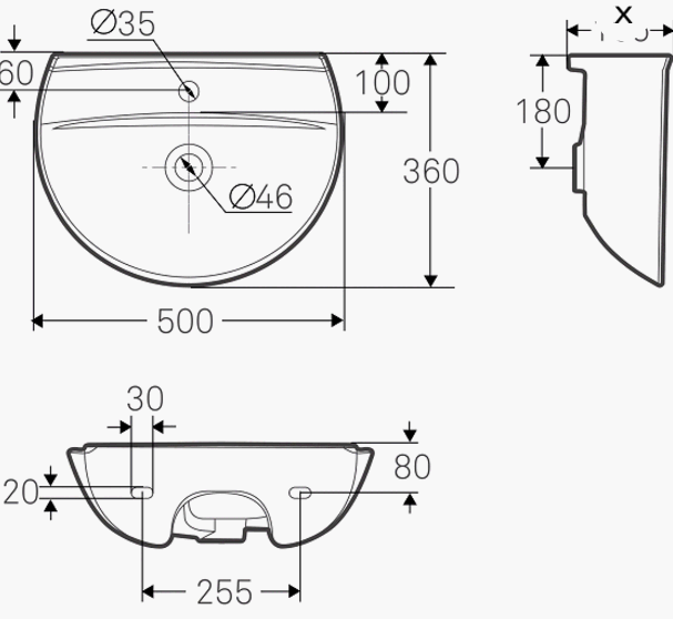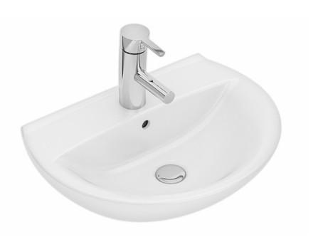 Håndvask med afsætningsplads på bagerste del af vasken. Fremstilles også uden overløbshul og hanehul, hvilket giver enklere rengøring. Monteres med bolte.
