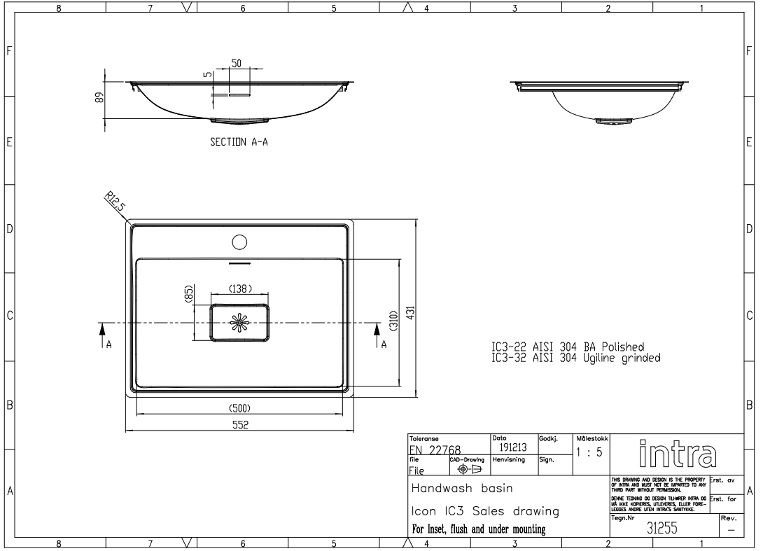 Intra Icon 3  50 håndvask t/underlimning eller planlimning - 1 hanehul