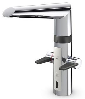 Køkkenarmatur med betjeningsvenlige greb til varm og kold vand, berøringsfri funktion, høj svingtud og perlator. Det varme og kolde vand justeres på separate greb. Tudens svingradius er forindstillet til 120° (kan begrænses til 60° eller 80°). Den berøringsfri funktion aktiveres ved, at holde hænderne indenfor sensoromådet. Vandtemperaturen på den berøringsfri funktion justeres ved, at dreje ringen mellem armaturet om svingtuden. Den berøringsfri funktion kan let slås til/ fra. Batteridrevet, 3 V. Armaturet er udstyret med smudsfiltre.