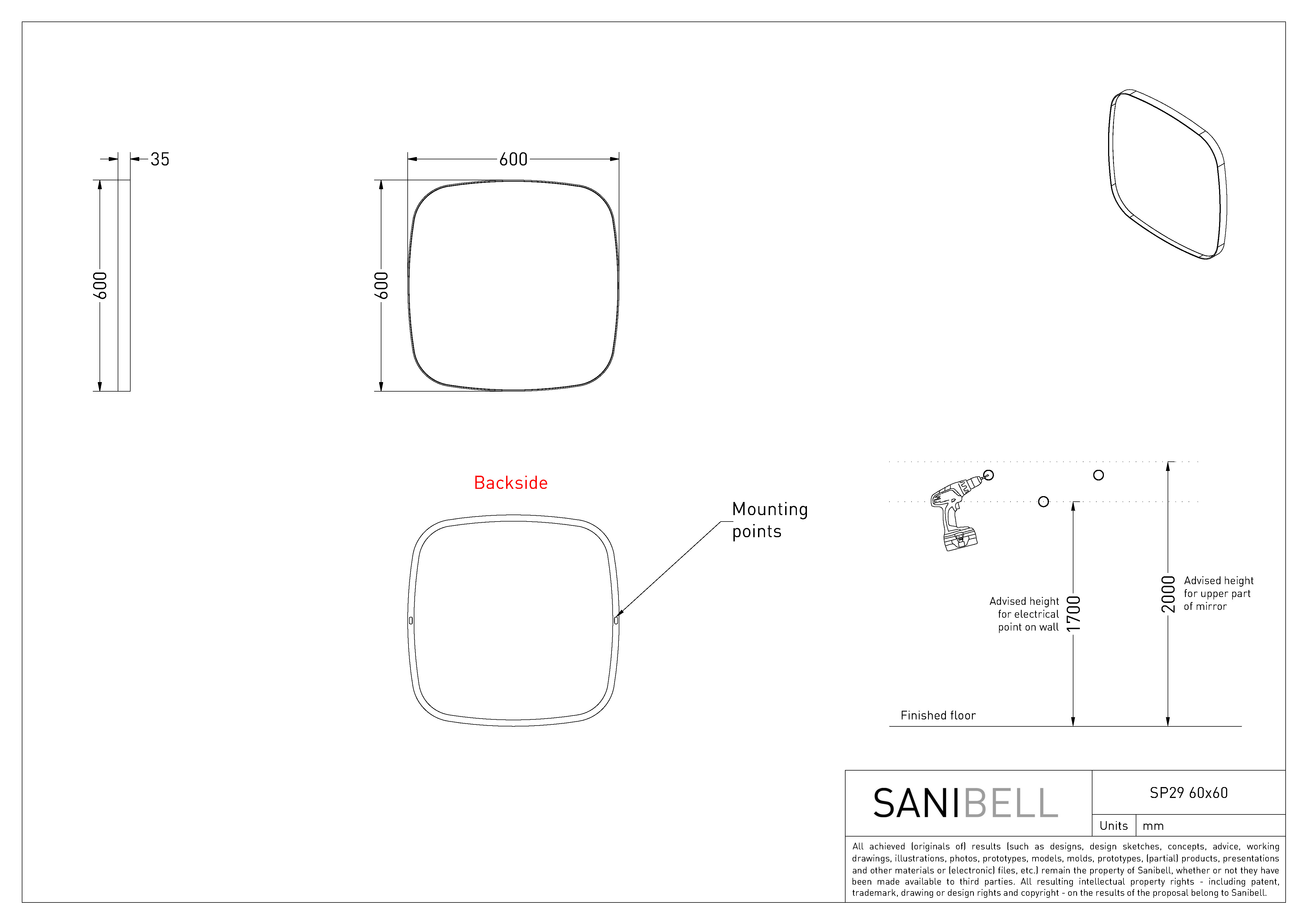 Minimalistisk spejl med ramme, som forfra er helt slank, men fra siden træder frem fra spejlets profil. Formen er superellipse og dermed ikke helt rund, og ikke helt firkantet.