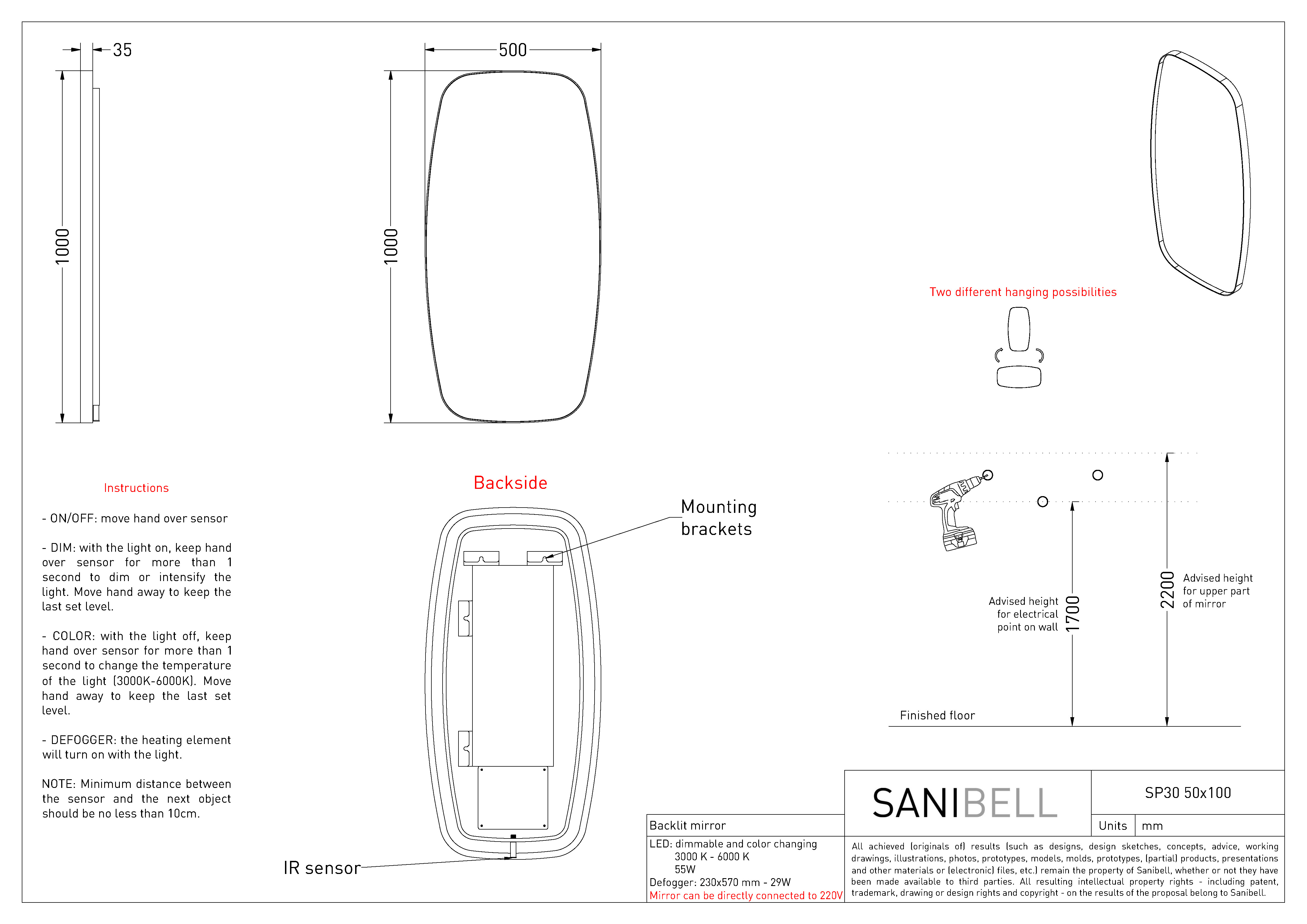 Sanibell Ink SP30 superellipse spejl m/backlight, varme og sensor 50 x 100 cm - Børstet kobber