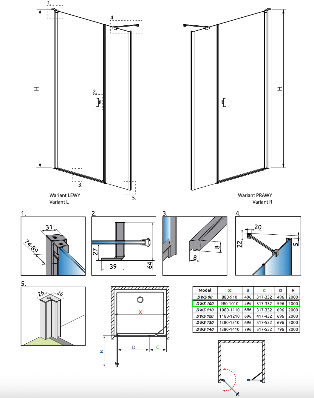 • Standardhøjde: 2000mm til overkant af glas