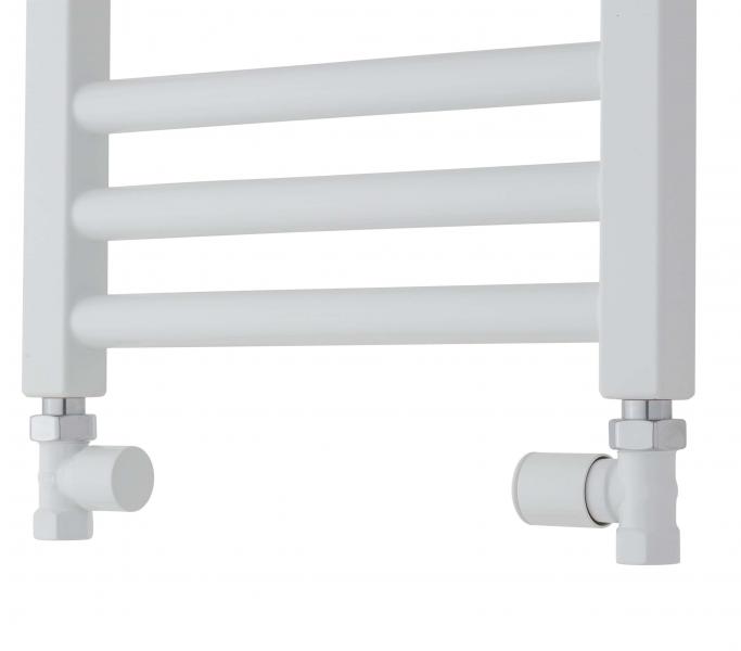 TVS lige ventilsæt type 110 vendbart - Hvid Ligeløbendeventilsæt type 110 Manuel ventilsæt type 110 er et ligeløbendeventilsæt som bruges når man skal have sin håndklædetørrer monteret på central- / fjernvarmesystemet. Brugen af denne type ventil kræver at der kommer rør op fra gulvet eller ned fra loftet. Man vil typisk bruge denne type ventil hvis man ønsker en løsning der ikke fylder meget og hvor der ikke skal reguleres på varmen jævnligt. Da reguleringen er manuel og ikke termostatstyret vil ventilen være meget følsom og der skal ikke skrues ret meget på ventilhovedet for at stille temperaturen. Ønsker men en ventil med termostat skal man vælge type 210 fra TVS i stedet for. TVS ventilsæt med ligeløbende ventiler - hvid. Manuelt reguleret. Med fremløbsventil og afspærre-/begrænserventil. Specifikationer: