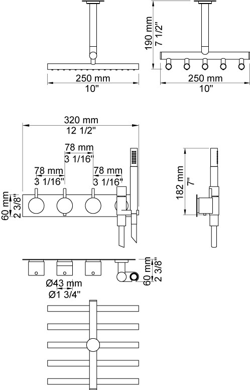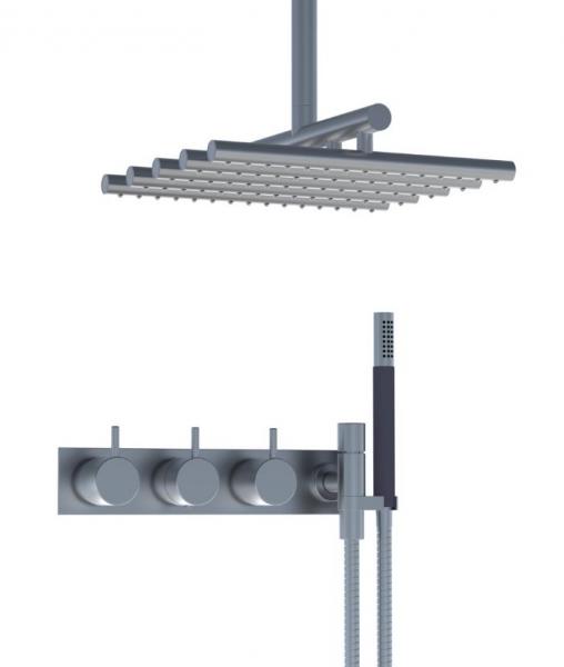 Vola Indbygningstermostat ¾'' med omskifter T2 håndbruser med metalslange og holder til højre Loftmonteret hovedbruser Separat udløb Dækplade Krom 16 3/4''RG/PEX