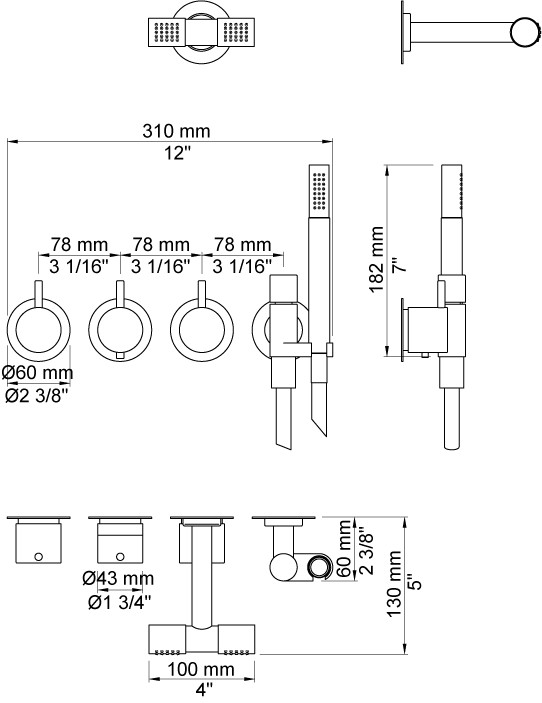 Vola 5471R-081D komplet brusesystem m/termostat - Krom Vola Indbygningstermostat ¾'' med omskifter T2 håndbruser med metalslange og holder til højre Dobbelt hovedbruser, 115 mm Separat udløb Rosetter Krom 16 3/4''RG/PEX |