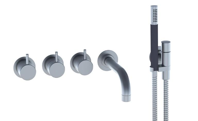 Vola 5411C-071 komplet indbygningspakke til kar - Krom Vola Indbygningstermostat ¾'' med omskifter Fast udløb, 160 mm, ø24 mm T2 Håndbruser med metalslange og holder Separat udløb Rosetter Krom 16 3/4''RG/PEX |