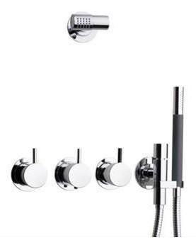 Vola Indbygningstermostat ¾'' med omskifter T2 håndbruser med metalslange og holder til højre Hovedbruser, 115 mm Separat udløb Rosetter Krom 16 3/4''RG/PEX