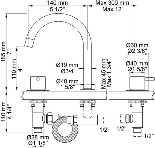 Vola To-grebsblander bestående af 2 stk keramiske stopventiler Svingbar udløb, udlæg 142 mm, ø19 mm Standard 25 mm Rosetter Krom 16 ½''RG