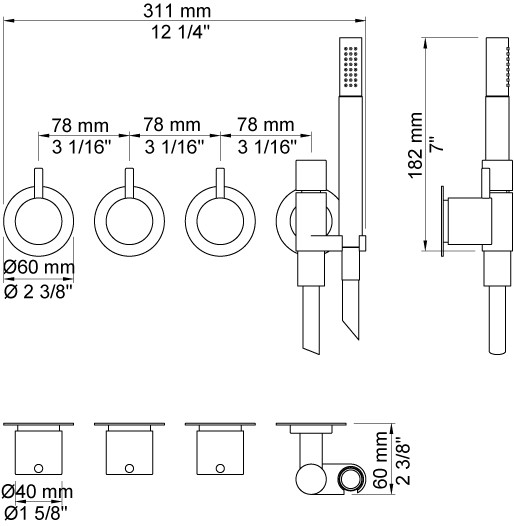 Vola To-grebsblander for stor vandmængde, med to løse afgangsmuffer T2 håndbruser med metalslange og holder til højre Separat udløb Krom 16 ½''RG/PEX