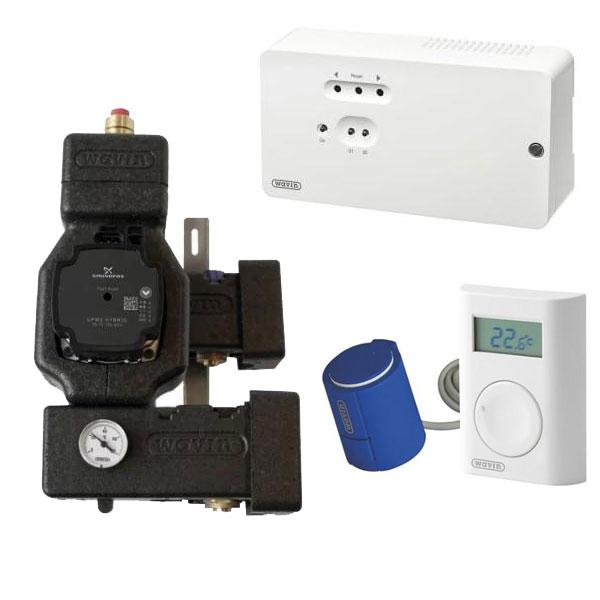 • Wavin parrallelshunt med Grundfos UPM3 Hybrid 15-70 cirkulationspumpe 1 kreds med isolering